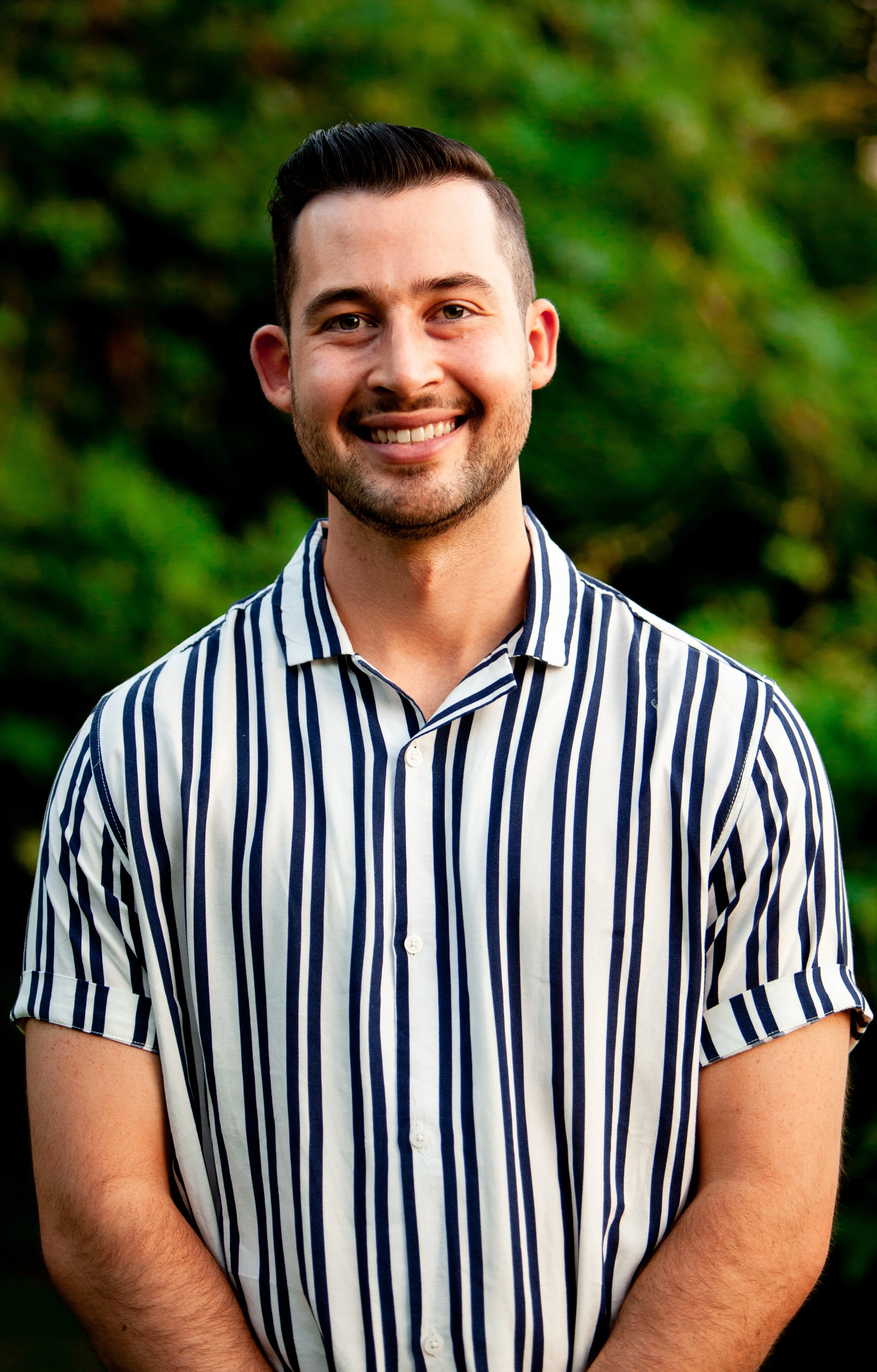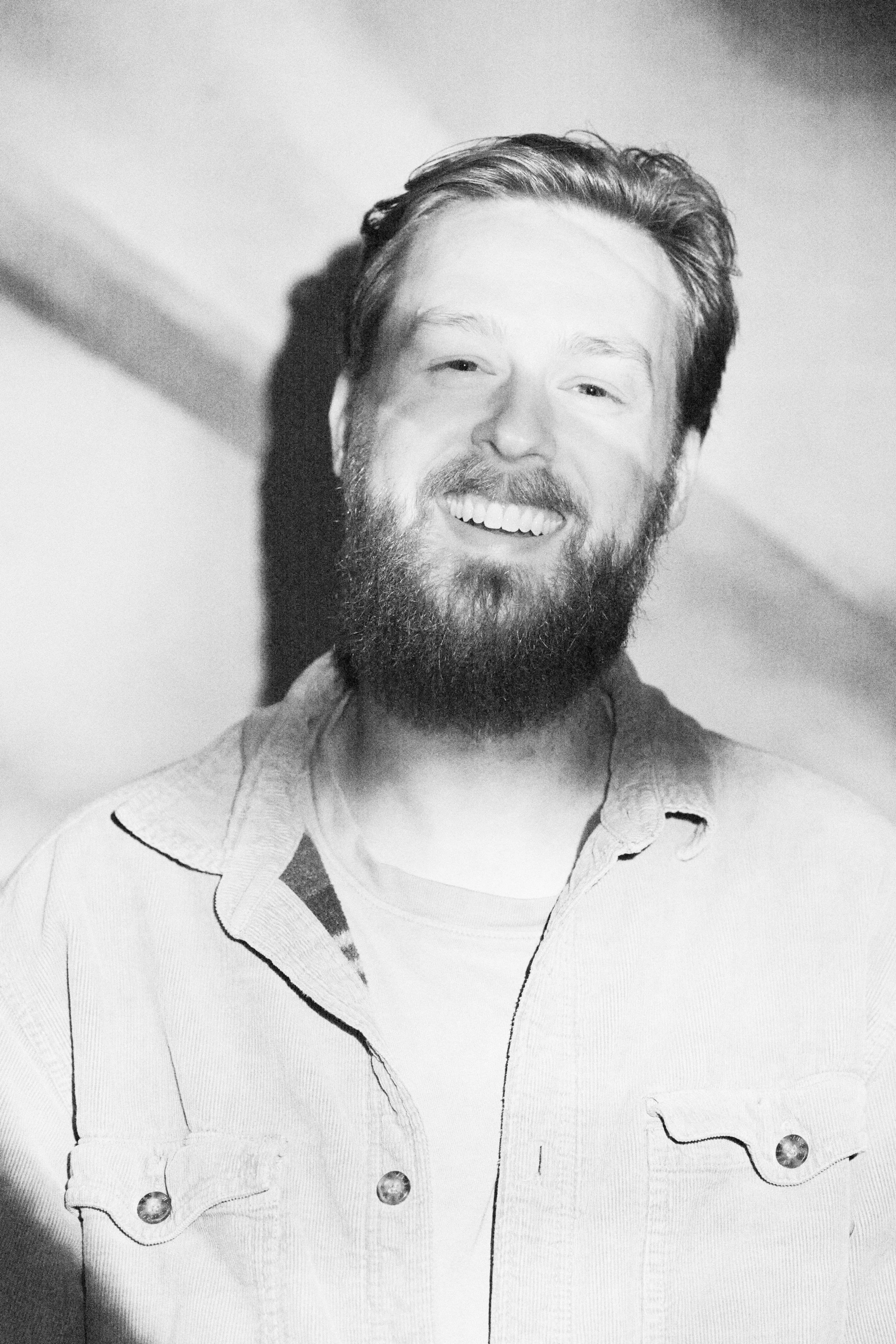 Black and white photo of a man with a beard and mustache, smiling, wearing a casual button-up shirt.